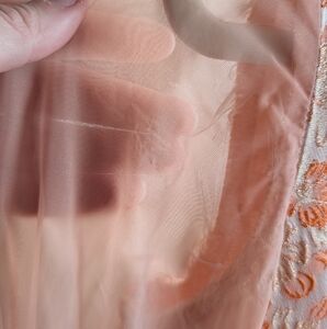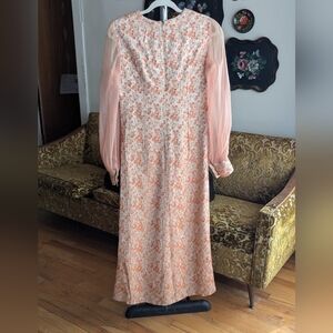 This elegant peach floral dress features delicate sheer sleeves, perfect for any special occasions!