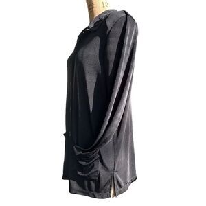 Shimmery Y2K black J M Collection Collared Cardigan Jacket Size Medium. Hip patch pockets and chest pocket. Slightly padded shoulders Small split up sides. Smart Casual jacket or cardigan can be buttoned to the top and worn as an untucked button down shirt . Suitable for all seasons.