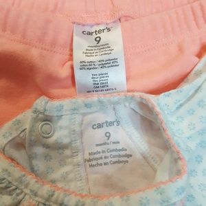Like New, white w/light blue print and neon peach threading onesie w/matching pants! Pants have a little ruffled bottom 😄