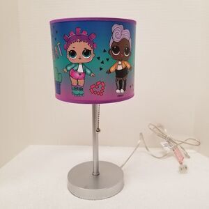 This is a 15-inch tall Shine Brite table lamp featuring a LOL character design. It is corded and has a modern style with a metallic finish. The lamp shade is included and has a drum shape. The lamp is made of metal and fabric materials, and the color is silver. It is designed for use in a bedroom . 5.620