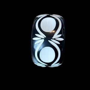 Shine Collection carved resin bangle bracelet is carved with a traditional India design. Colors are black and white. It is a wide width bangle measuring 2”” wide and an opening of aprox 2 3/4”. A beautiful statement piece that is versatile and will compliment your wardrobe all year long.