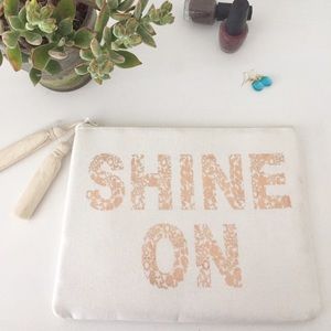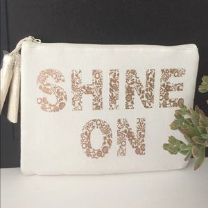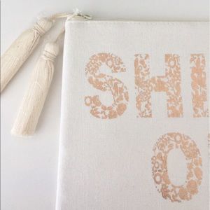 Keep shining with this adorable canvas pouch. Lettering is in rose gold foil in a rose pattern (see closeup photos). Lined in easy to clean vinyl, so this can double as a makeup bag!!