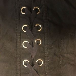 Black stretch poly & spandex. Features gunmetal grommets and black lace up down each leg. Very trendy. 68% Rayon 27% Nylon 5% Spandex