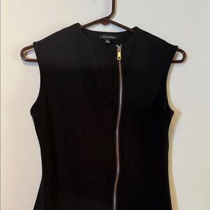 Chic black mini dress with a sleek zip-front design. Sleeveless and stylish. Perfect for any occasion.