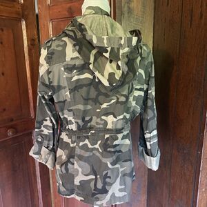 The Shinestar Jacket for women in size large is a stylish and functional piece perfect for outdoor activities. Made from lightweight cotton with a camouflaged design, this mid-length jacket features a full zip closure, long sleeves, and pockets for convenience. The hood adds an extra element of protection, while the breathable fabric ensures comfort during various seasons. Ideal for travel or casual wear, this green jacket with button and zipper accents is a versatile addition to any wardrobe.
