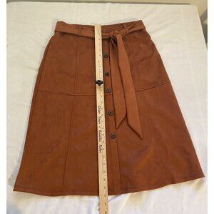 A stylish and comfortable brown rust faux suede A-line skirt featuring a tie waist and faux button front, offering a versatile and flattering look.