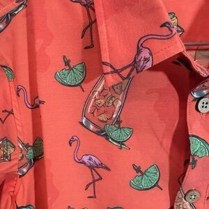 Get ready to party with this Shinesty men's button-up shirt in size M. The vibrant orange color and graphic print of a Captain Morgan cocktail and flamingo make it perfect for a fun night out. The short sleeves and collared neckline add a touch of sophistication to this casual shirt.