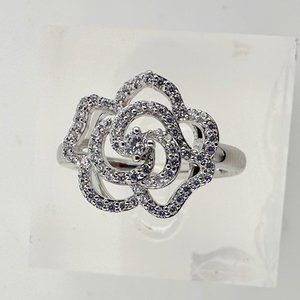 Pretty unique style in this white sapphire set. Floral / rose shape or random swirs. Shines beautifully in any light.