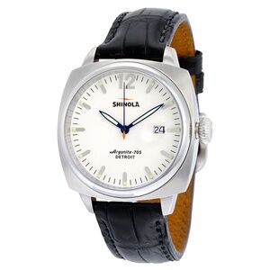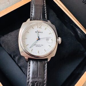 he Shinola Brakeman 40mm with a black crocodile leather band is a stylish and luxurious wristwatch designed for men. This two-piece strap watch features a square case with a polished silver finish and a solid caseback. The watch has a left-handed design with Arabic numeral indices and a 12-hour dial, making it a unique and functional timepiece. With 6 jewels, a quartz movement, and water resistance up to 50 meters, this Shinola watch is both durable and reliable. Additionally, it comes with a lifetime manufacturer warranty and original box/packaging, making it a valuable investment for any watch enthusiast.
