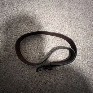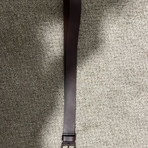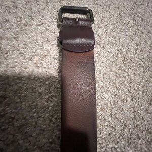 Stylish brown leather belt featuring a sleek silver buckle. Perfect for any outfit.