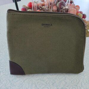 This is a Shinola Detroit zipper bag.   Measures 8x6 1/2,  zips all the way around.  It has a brown leather edge on the left side and a brown leather zipper pull.  It is olive green.
