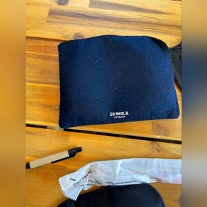 new Shinola Detroit Travel Bag Set with Accessories. Shinola travel set featuring a black eye mask and socks. Includes a pen, toothbrush/toothpaste and cream.