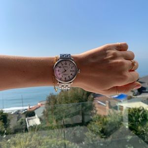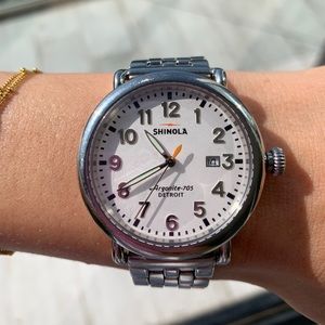 I am actually so obsessed with this watch and Shinola’s designs are so refined and versatile and unisex but as you can tell I only wear gold! Purchased in Detroit, in near-perfect condition with very minimal signs of wear. The links can be removed or added on for sizing! Silver numbers, white matte dial face and silver hardware. Please let me know if you have any questions!