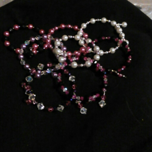 A set of eight bracelets with pink and white pearls and pink black and clear crystals....