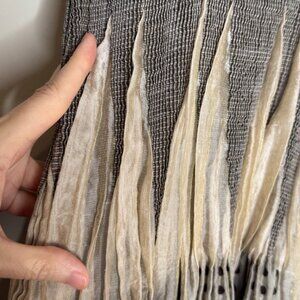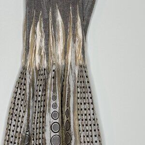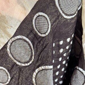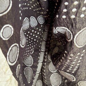 The top color of this dress is a shiny beige with a bronze hue to it with dark greyish brown/black circles and accents on the design, but the underside of the dress is really neat too, almost like you would wear it inside out. There are a couple of random strings hanging off this dress I can ship before sending.
