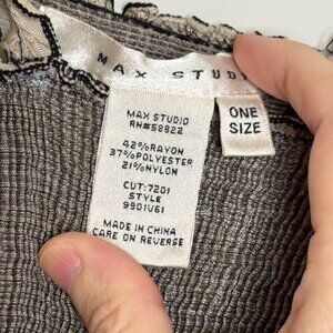 I can't remember if I bought this or if it was given to me. It has one of those scrunched expanding tops that can quadruple in size depending on how wide you stretch it. Flat lay it measures 10" across but can stretch to much more than that. When I stretch it with my hands it goes to 25" across at the top. The Ruffled top of the dress that helps hold it up, actually are not necessary as you can wear this dress without them, but they fold in on themselves, even after ironing. This dress is 33" long on a flat lay. There are neat fan-type pleats about the waist on this dress then it flares out almost like a a-line skirt on the bottom part of this dress.