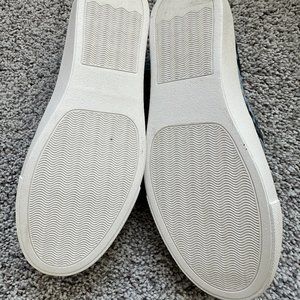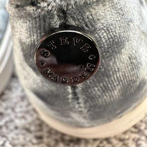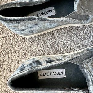 Very pretty, worn only once, blue/silver shiny slip on crushed velvet shoes by Steve Madden.