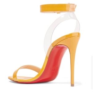 These are an authentic pair of CHRISTIAN LOUBOUTIN Patent PVC Jonatina 100 Sandals size 39.5 Topaz and Transparent. 4.5 inch heel, authentic with box and wrapping included.