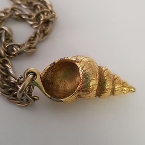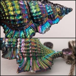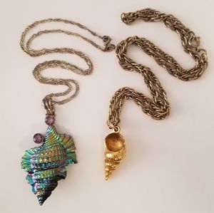 Iridescent rainbow coated lightweight shell (~2"x1") with 16" silver chain & vintage faux gold heavy shell (~1"x0.5") with 18" chain. Selling as a set. Small spots of exposed metal on gold edge. Tiny chips on iridescent edge. See photos.
