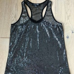 Black tank top, shiny in the front and black on the back. Never worn. Excellent condition.