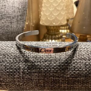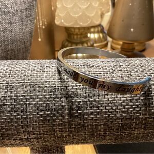 Shiny silvertone open cuff bangle bracelet has a width of 3/8” and fits up through and including an 8” wrist. The beautiful message that make this bracelet special is “Marriage made you my family . . . Love made you my daughter.” Wonderful gift!