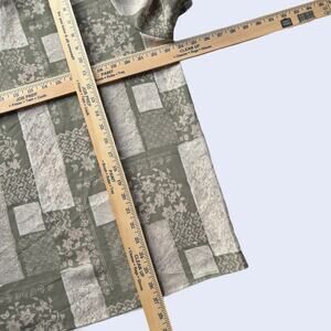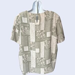 Vintage patchwork-print short-sleeve blouse in sage green and cream. Relaxed boxy fit with crew neckline and back keyhole button. Lightweight woven polyester; Made in Korea (early 90s vibe). Allover floral + geometric patchwork. Condition: good preowned.