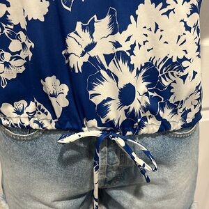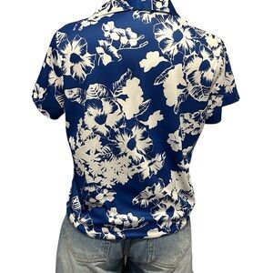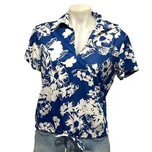 Ship n Shore vintage blue and white Hawaiian print v neck short sleeve collar shirt with drawstring waist