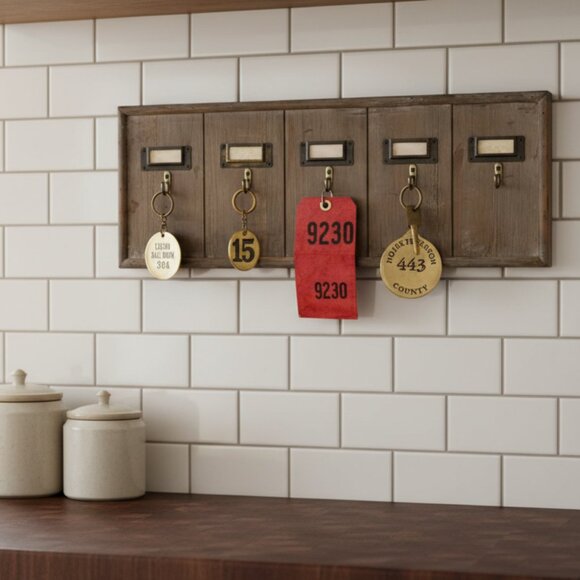 This charming vintage-style key rack features a weathered wooden base with five metal hooks