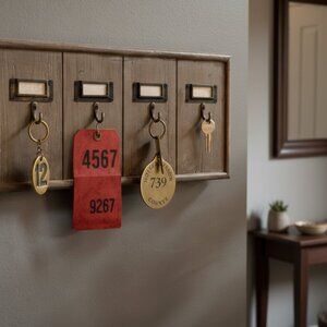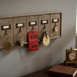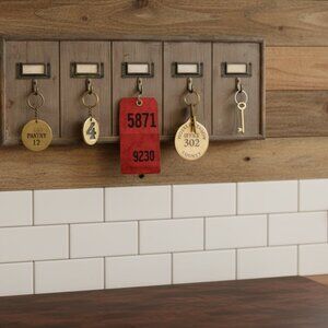 Multi Key Holder Wood Wall Rack features a vintage style with 5 hooks, perfect for storing keys in an office, motel, or hotel setting. Handmade from wood with a rustic finish, this rectangular key rack adds a touch of antique charm to any space. The wall-mounted design and hanging features make it both functional and stylish, ideal for keeping keys organized and within reach.