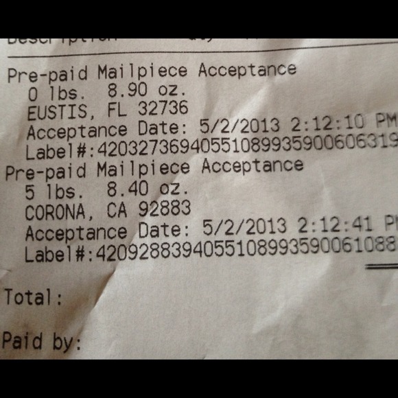 Just curious, you used a pre paid shipping label from posh and the post office gave u this receipt as confirmation for acceptance by the USPS? My stupid post office told me they can't give receipts for ore paid! And I had to pay $1.20 for some b.s. certificate of mailing which is basically just a piece of paper!