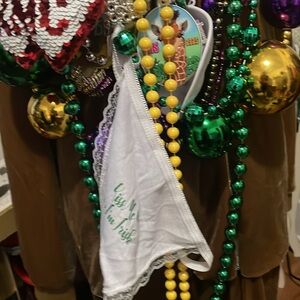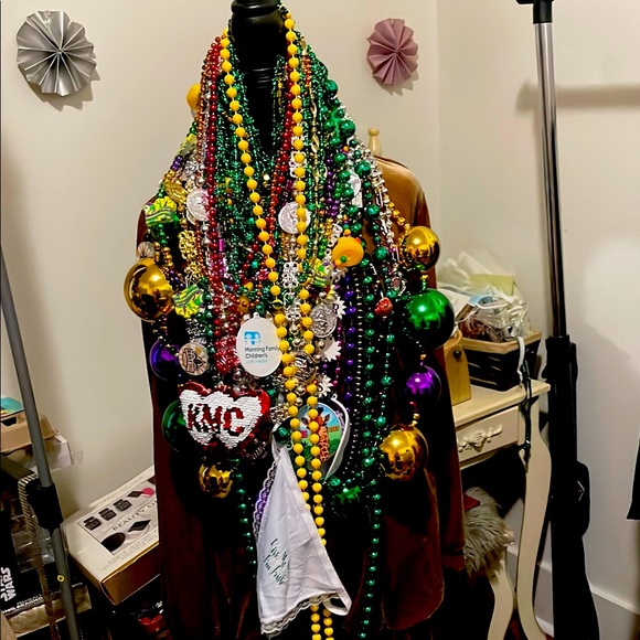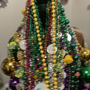 Vibrant collection of beaded necklaces in green, yellow, and purple. Perfect for festive occasions.