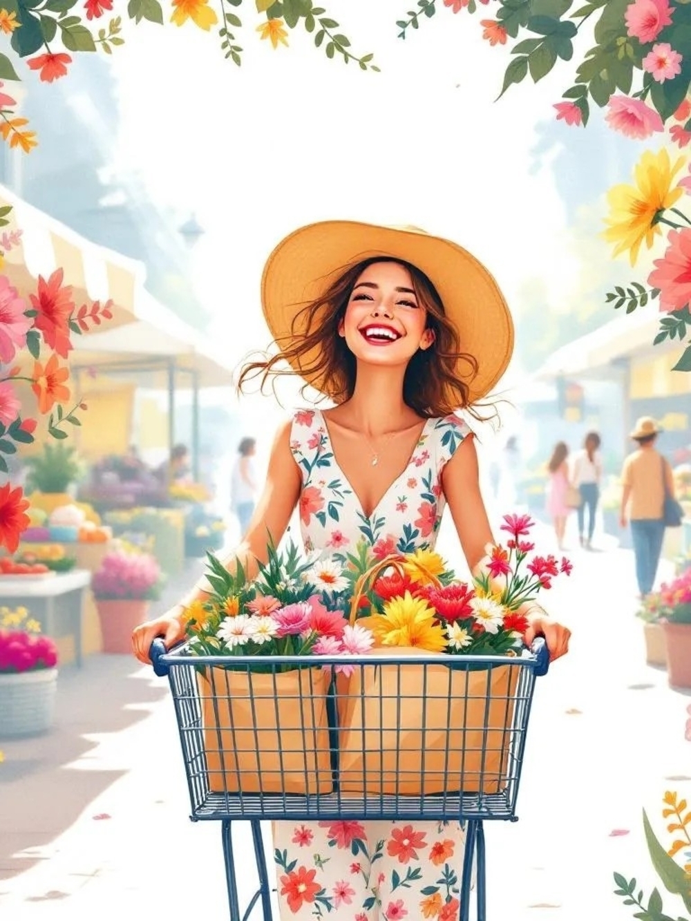Bright floral V-neck sundress. Sleeveless design with colorful flower print. Styled with a wide-brim straw hat. Cheerful summer look.