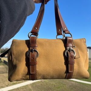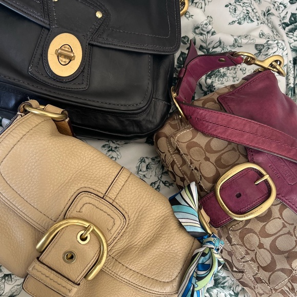 Stylish Coach shoulder bags in black, beige, and pink. Elegant design with gold accents. Perfect for any occasion.