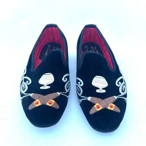 Unique Shipton & Heneage men’s velvet smoking slippers in black with embroidered cigar and smoke design. Finished with quilted red lining and leather soles, these collectible loafers offer refined British luxury with playful detailing. A rare statement shoe perfect for black tie events, upscale loungewear, or standout evening style. Heritage quality and distinguished design.