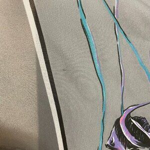 Lightweight scarf with a fantastical underwater ocean scene including a sunken pirate ship, treasure chest, fish and a conch shell. Semi-sheer fabric in gray with pink, blue, and purple.