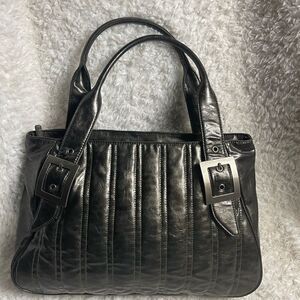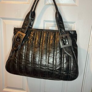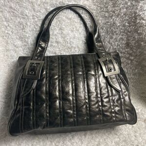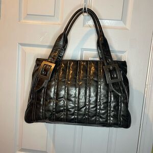 Shiralea metallic grayish bronze quilted faux leather large shoulder bag .silver tone buckle accent double straps.pre owned in good used condition normal wear clean no peeling see all pictures any questions please message.F3