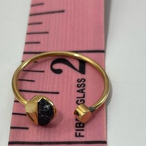 Featuring two points of interest, one black white marbled piece, and a gold tone disc hosted on a gold tone, size 8 yet adjustable, ring. (each ring is a little different).