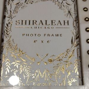 Shiraleah Chicago, Elegant and Chic frame with ivory finish and brass stud accents. The frame is designed for a 4"x6" photo. it has an easel back for tabletop display and also can be hung on the wall. used in good condition. there are 3 brass studs that are missing it is still very beautiful and stylish. the total width of the frame is 7.5 and the length is 8.5. Perfect for adding cheek touches to anything of your decor. please look at the pictures carefully for the missing studs. make me an offer