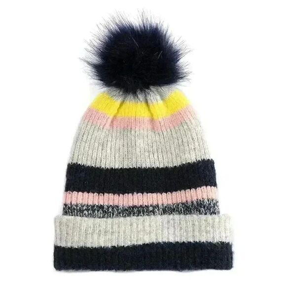 Shiraleah Nancy Women's Gray/Pink/Yellow/Navy Acrylic Blend Striped Knit Cuffed Beanie w Pom-Pom NEW NWT sz OS