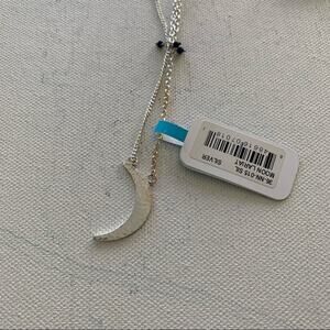 Features: Silver Moon Lariat Necklace; boho style, delicate moon pendant, Midnight blue beaded accent