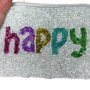 Add a pop of positivity to your day with this handmade beaded zip pouch. Featuring the word happy in vibrant, multicolored beads against a crisp white background, this compact card holder is as joyful as it is practical. Perfect for carrying cards, cash, or small essentials, it zips securely to keep everything in place—and your vibes high.