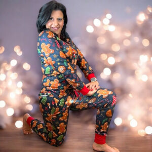 Transform your lounge wear with these adorable PJ sets! They come in a lovely dark blue adorned with a charming gingerbread