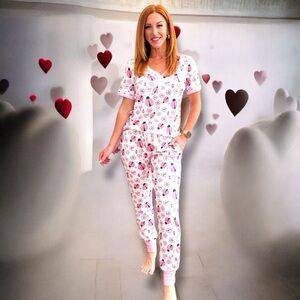 Check out the Shirley & Stone You're My Love Bug! Jogger PJ Set—it's the perfect mix of cute and comfy! The pink pajama set is decorated with adorable candy hearts and ladybugs, and the short sleeve top features a flattering v-neckline and button closure. Pair it with the matching joggers for a fun and playful bedtime getup! You’ll love the faux button neck and functional drawstring that add a charming touch, plus there’s a convenient pocket at the bottom—perfect for stashing little essentials. The stretchy fabric is super comfy, making them ideal for lounging around all day. And the true-to-size fit hugs you just right without sacrificing comfort. Made from 92% Polyester and 8% Spandex, they feel wonderfully soft and lightweight. Whether you’re cozying up at home or catching some much-needed Z's, these PJs will keep you feeling stylish and relaxed.