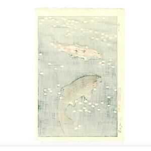COMMENTS: Delighful view of koi swimming in pond with floating cherry blossoms. Skillfully printed "bokashi" shading, light "gauffrage" (embossing), highly detailed, "semi-sosaku-hanga" style. Later-edition printing.