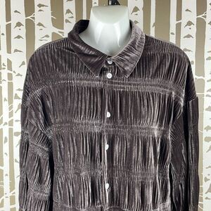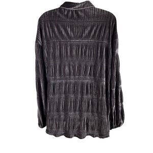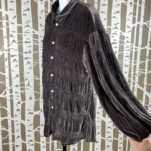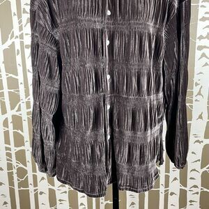 Additional Details: Super soft/shiny shirred velour fabric, shirred cuffs create a balloon/peasant sleeve effect, contrasting white buttons.