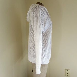 Shirt 469 open weave white pullover top with hood size Large Linen/Cotton blend washable 20" across bust and back, 23" long with pouch raglan sleeve