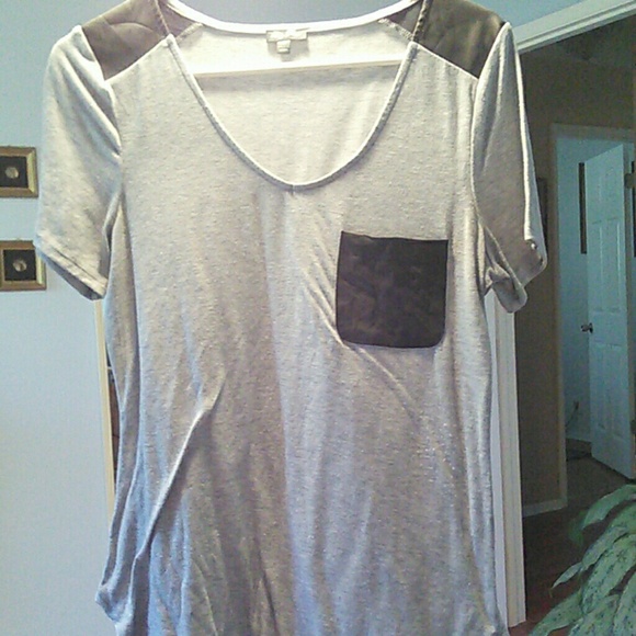 Black n grey shirt with leather on shoulders and pocket is leather