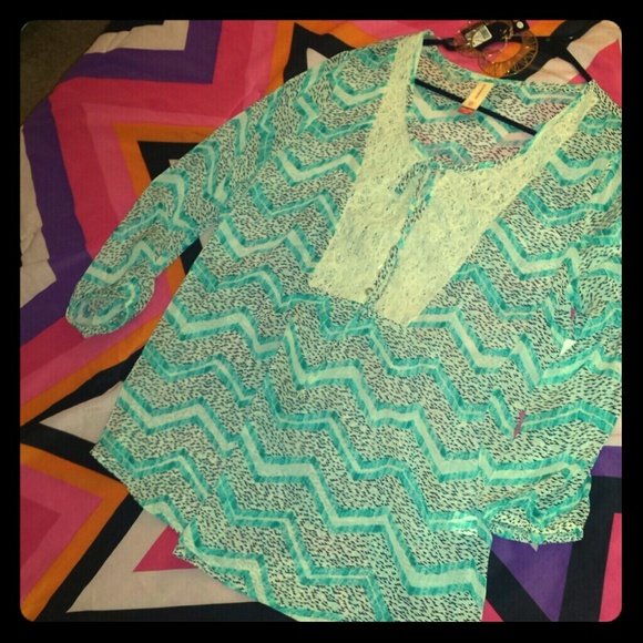 Aqua blue/cream printed chiffon blouse. Gorgeous color and fit, camera does not do justice, more vibrant in reality. It says size XXL on the label but will fit a 16 best or a 18 with smaller frame. Perfect spring color. Brand new. Never worn.