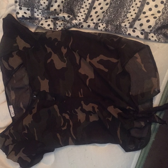 Has a tie in the front at the bottom and buttons on the middle that don't open if you have big boobs it won't go with you