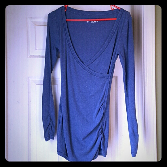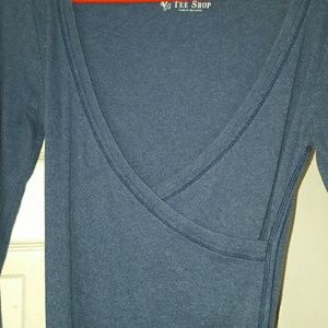 Blue long sleeve shirt low cut draped front